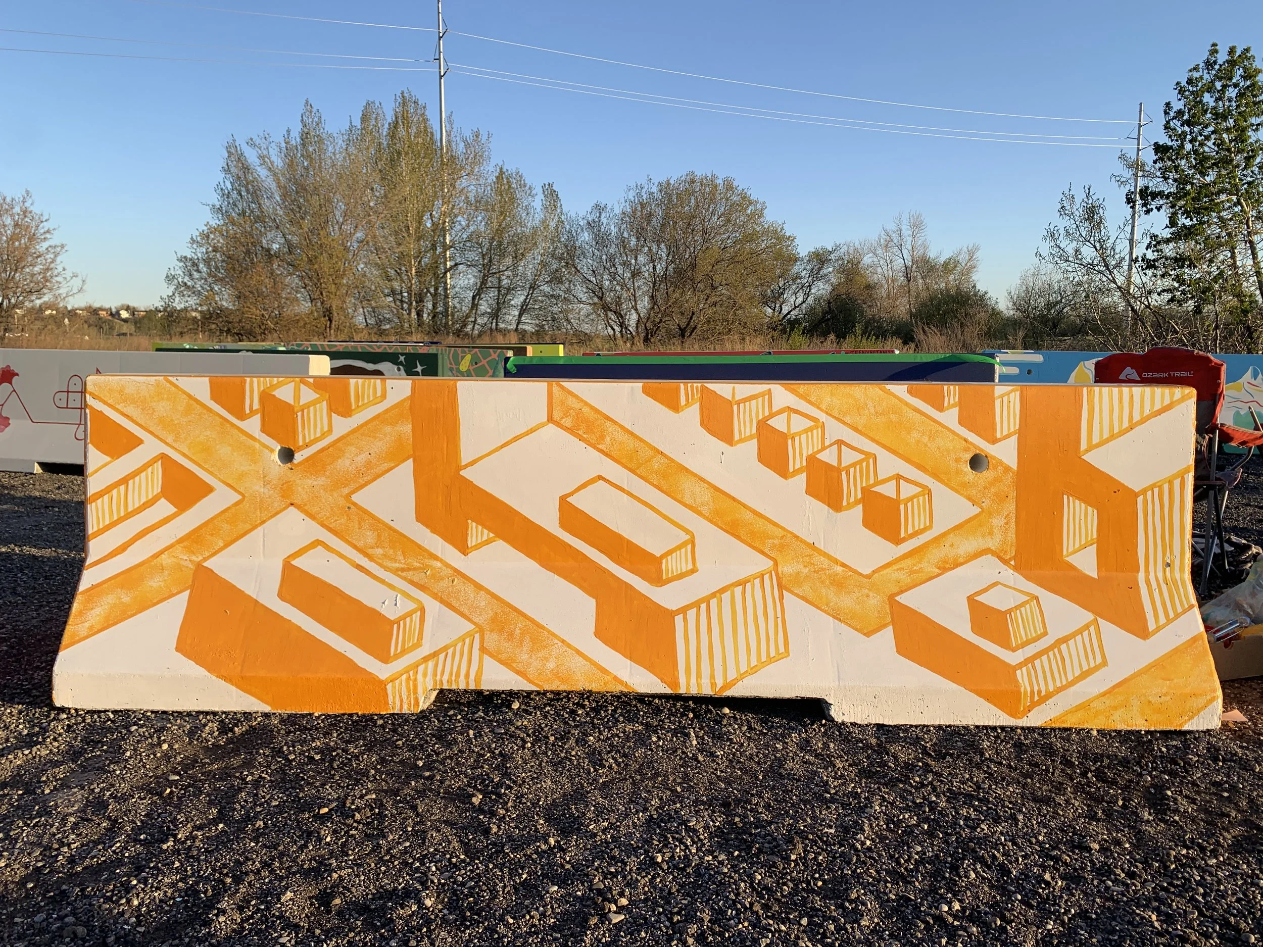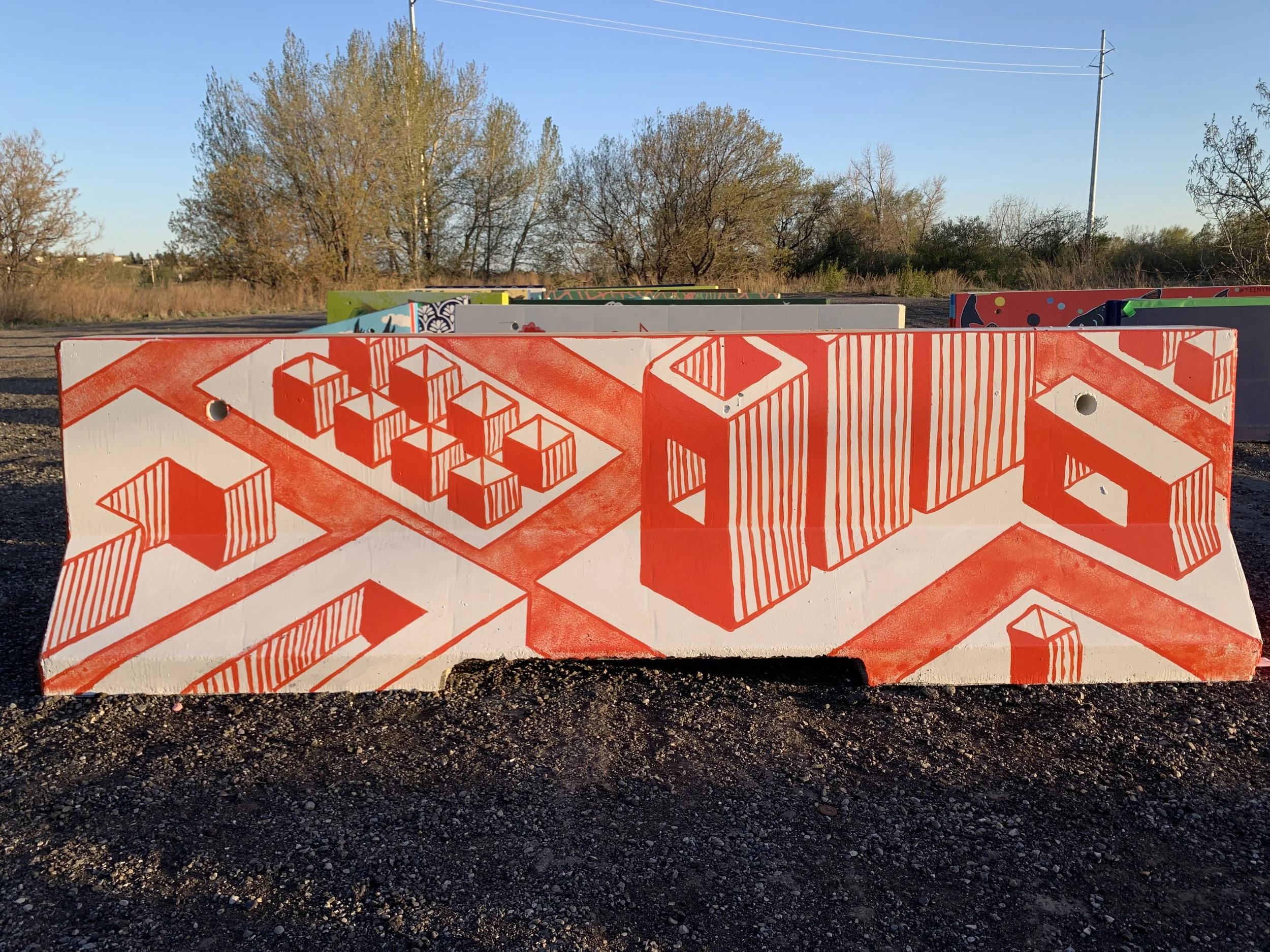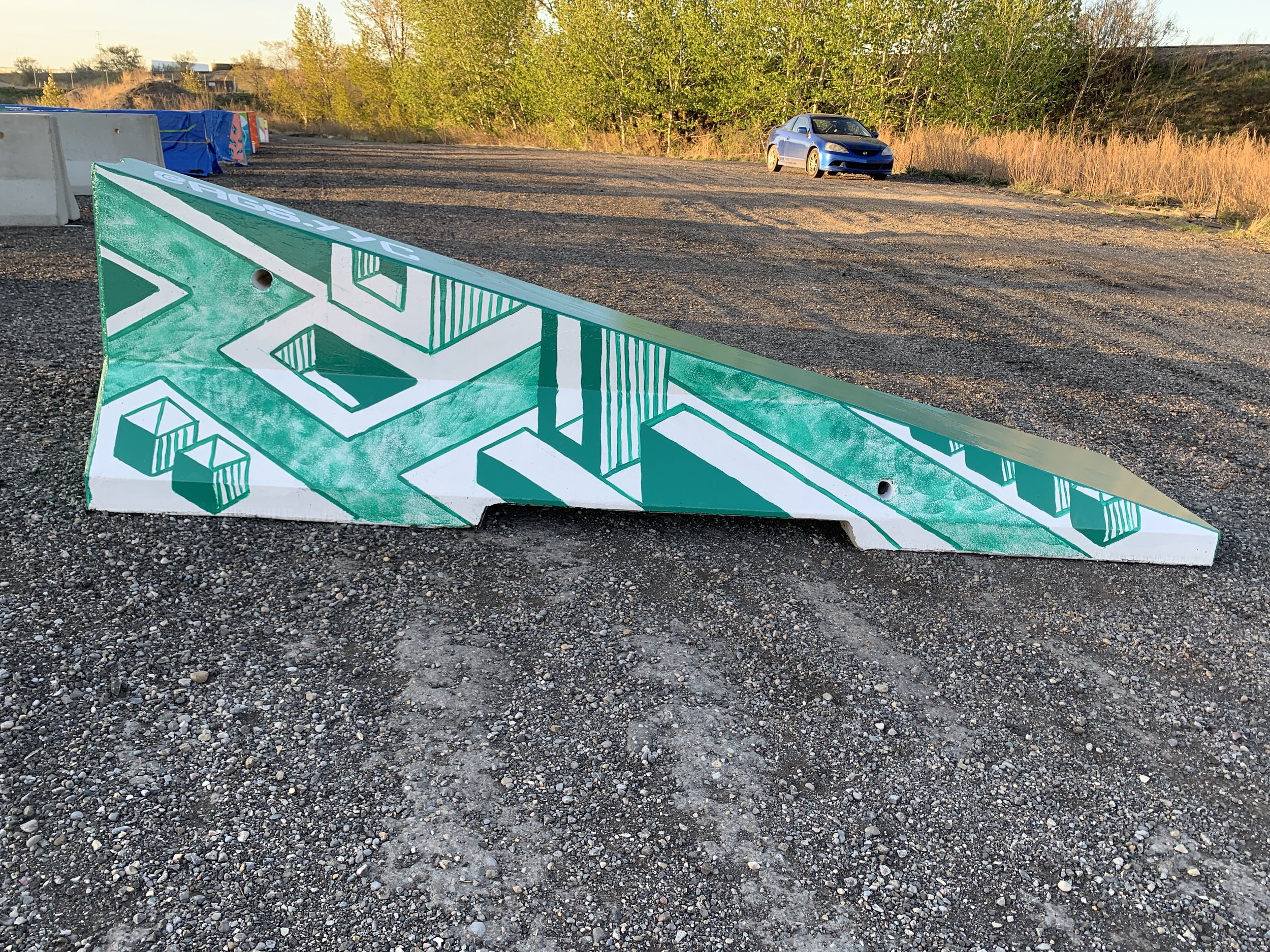 4 city road barriers, painted with an isometric design concept that portrays the balance of cities being both rigid while playful, structured yet chaotic, controlled yet random.