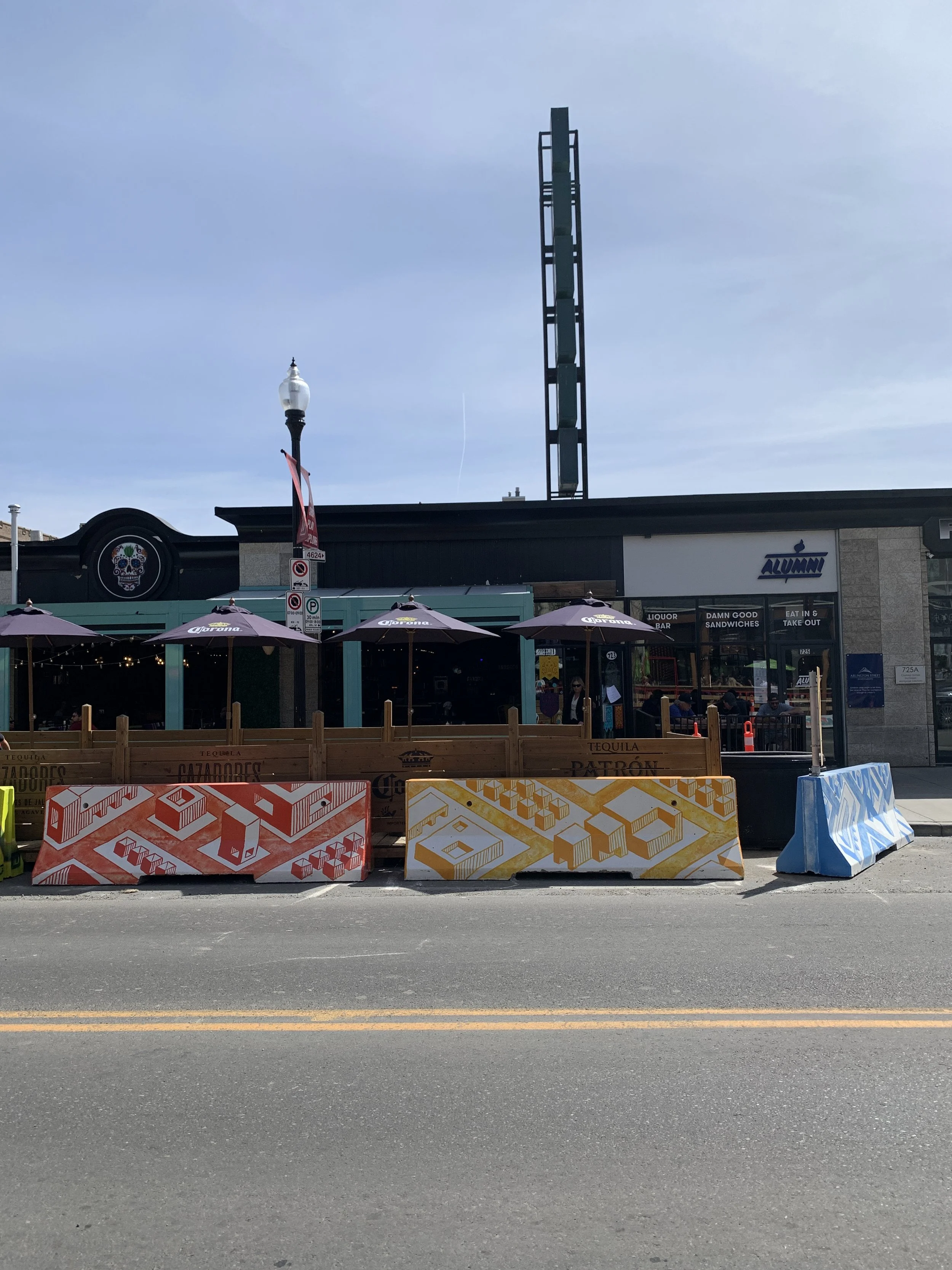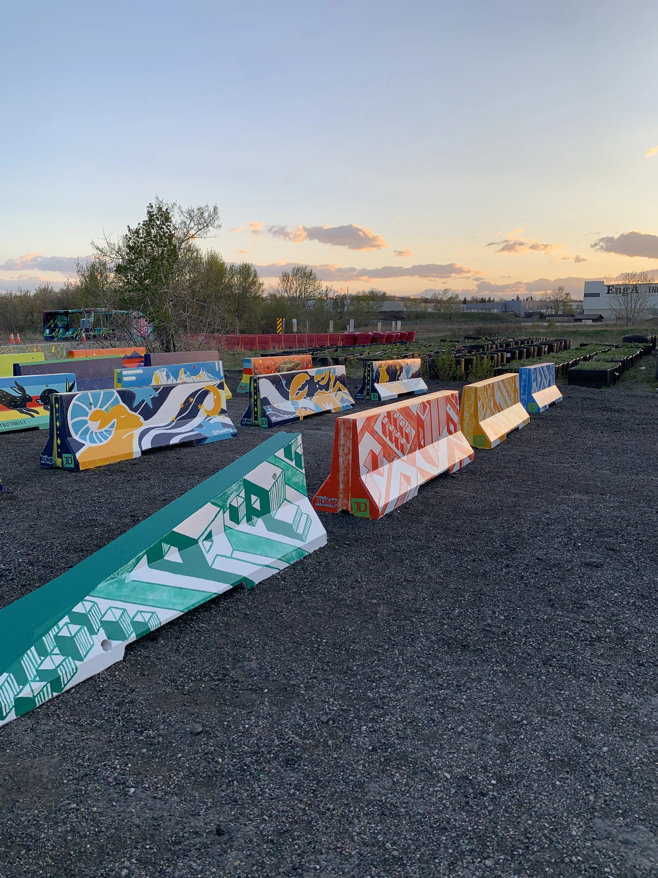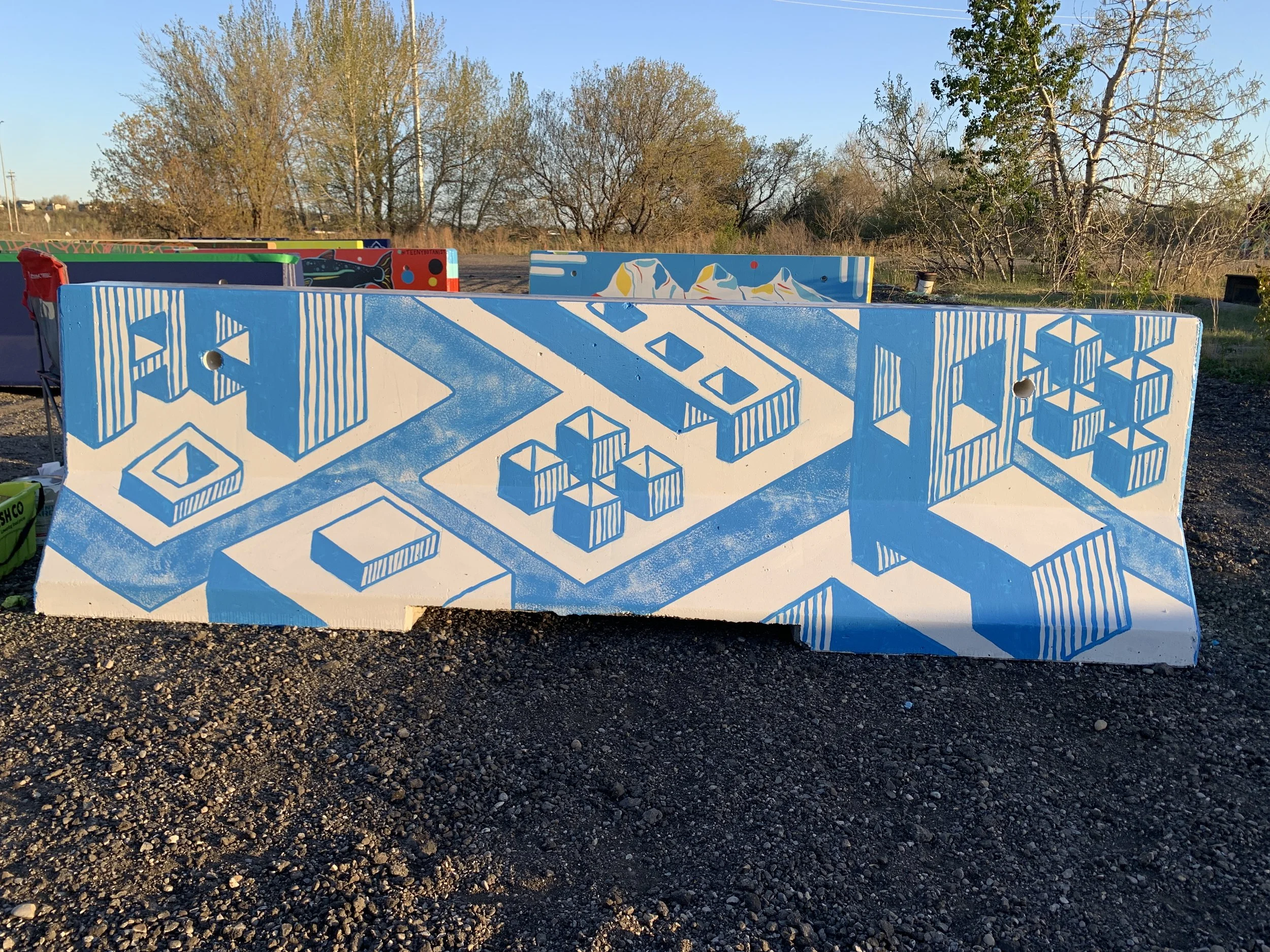 4 city road barriers, painted with an isometric design concept that portrays the balance of cities being both rigid while playful, structured yet chaotic, controlled yet random.